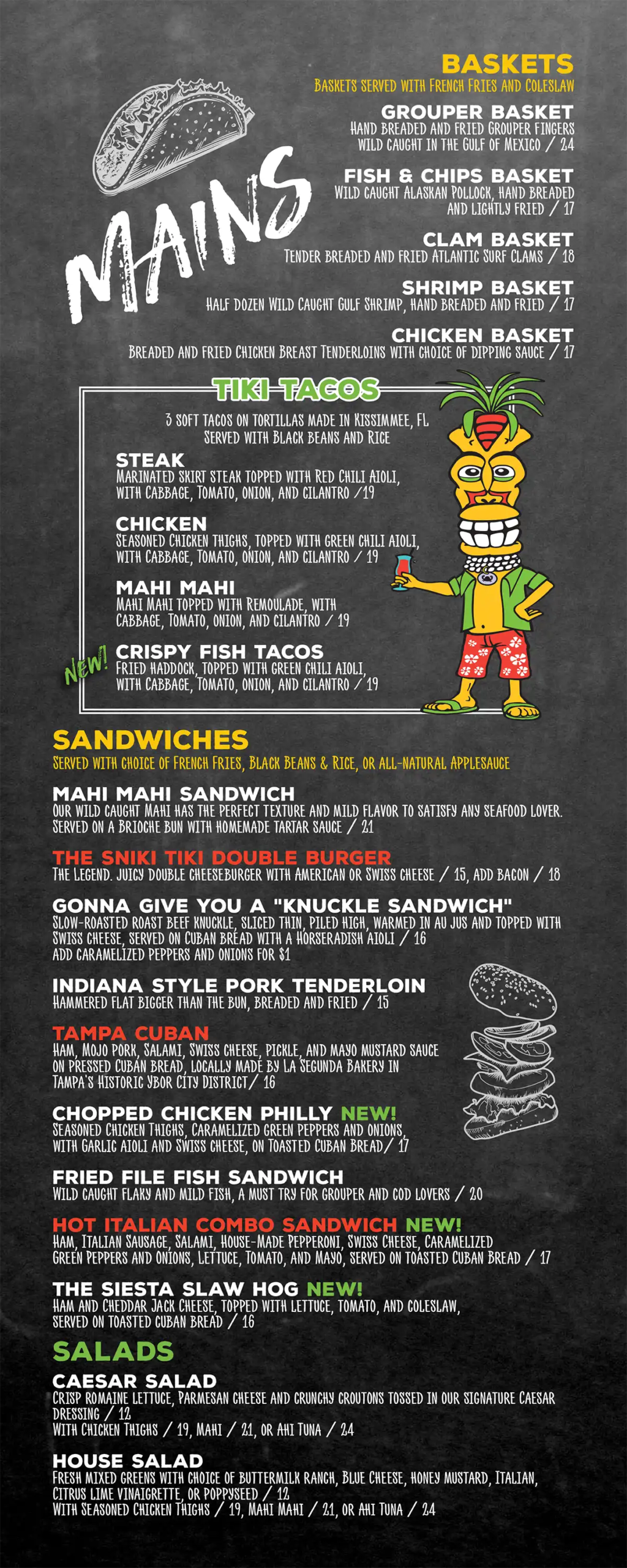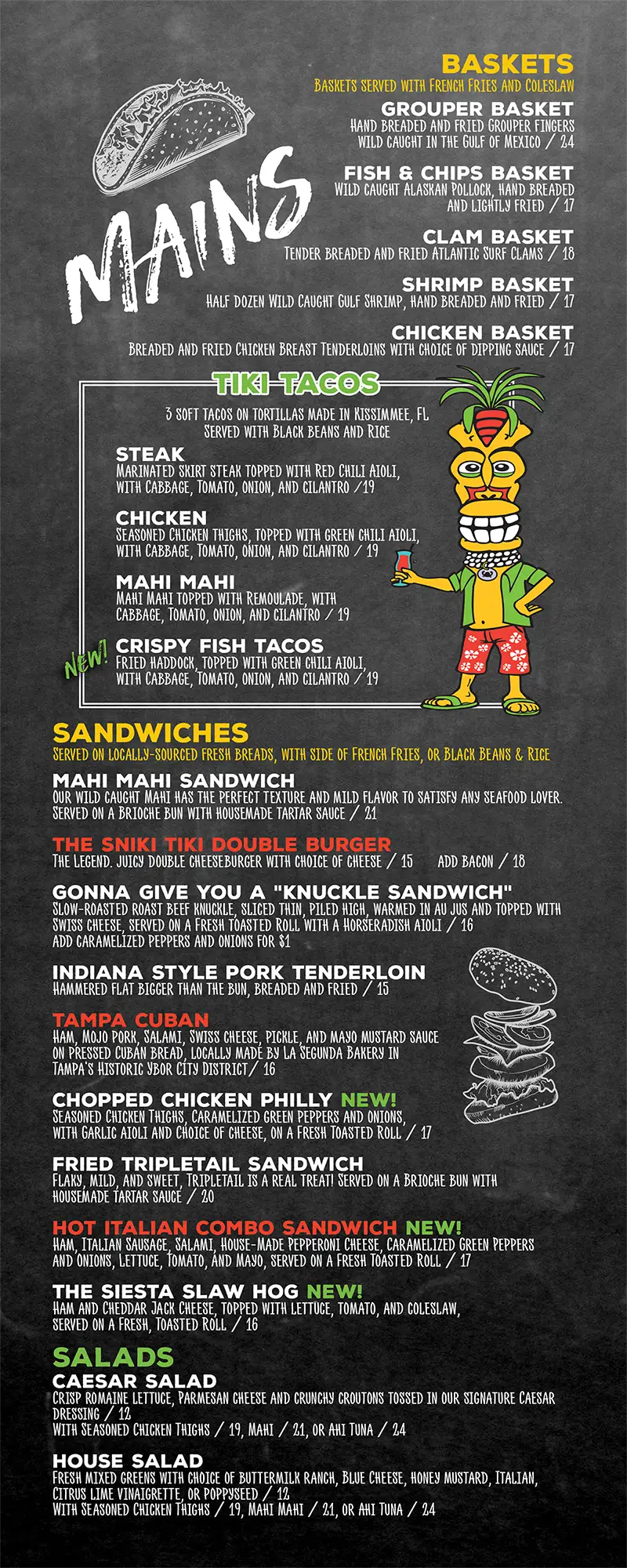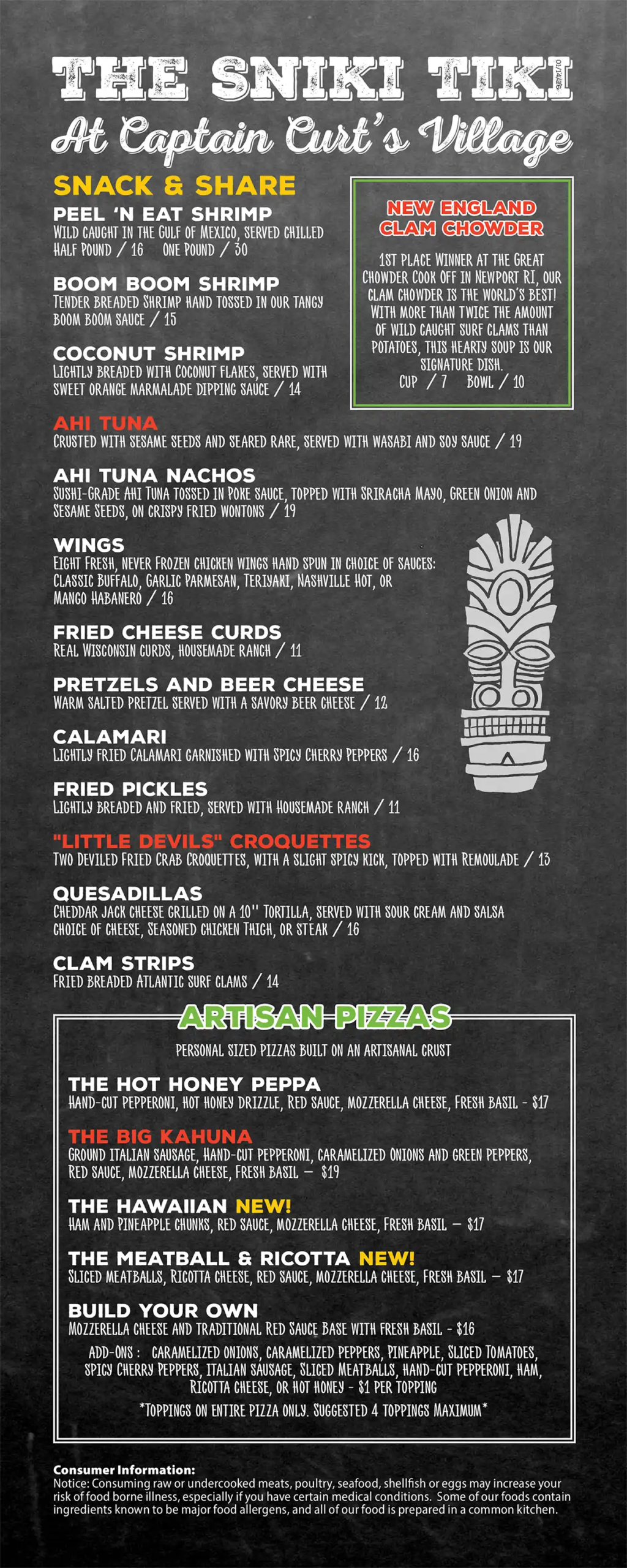 At Sniki Tiki, we have rotating specials and a large variety of shareable entress and appetizers.